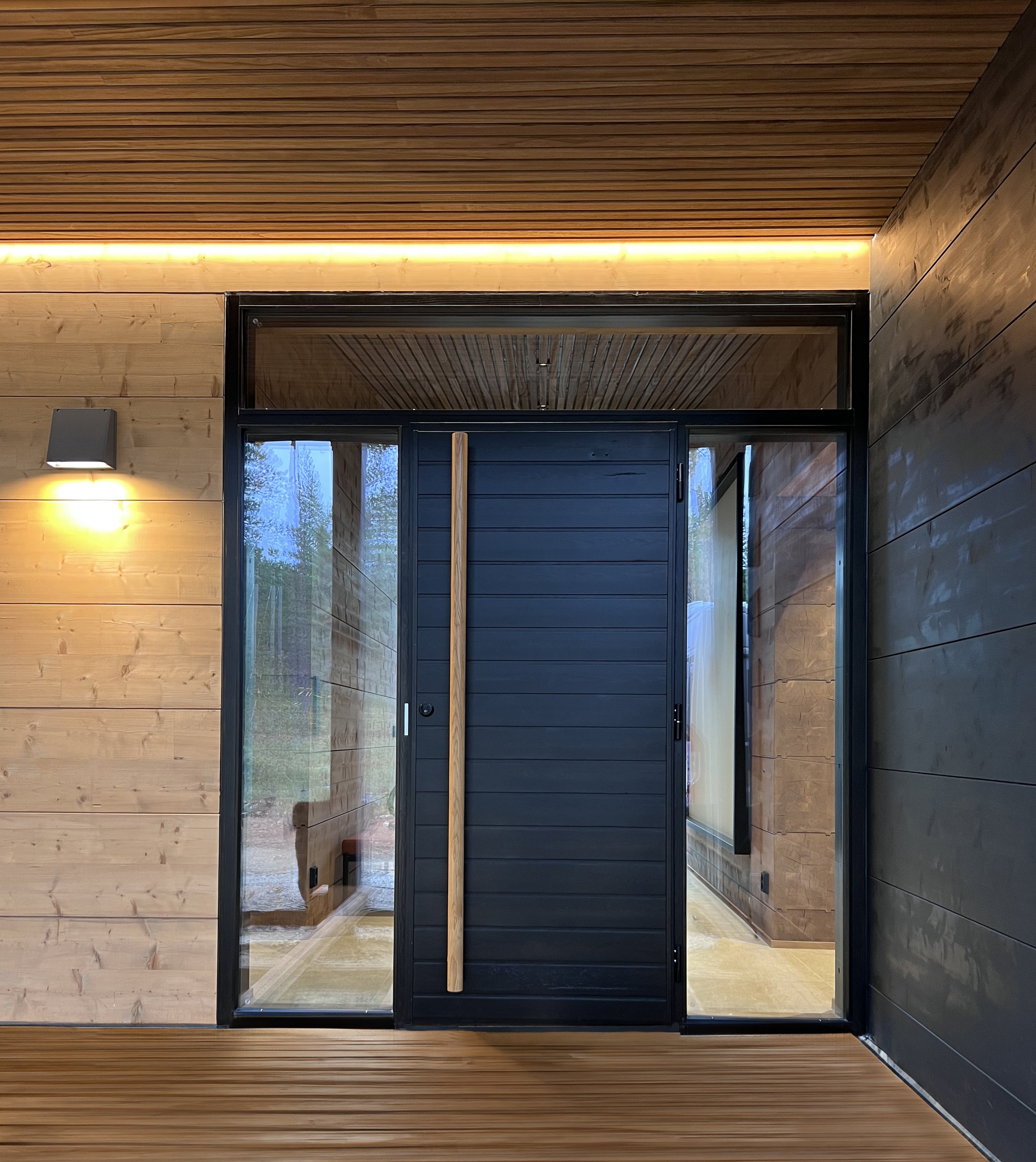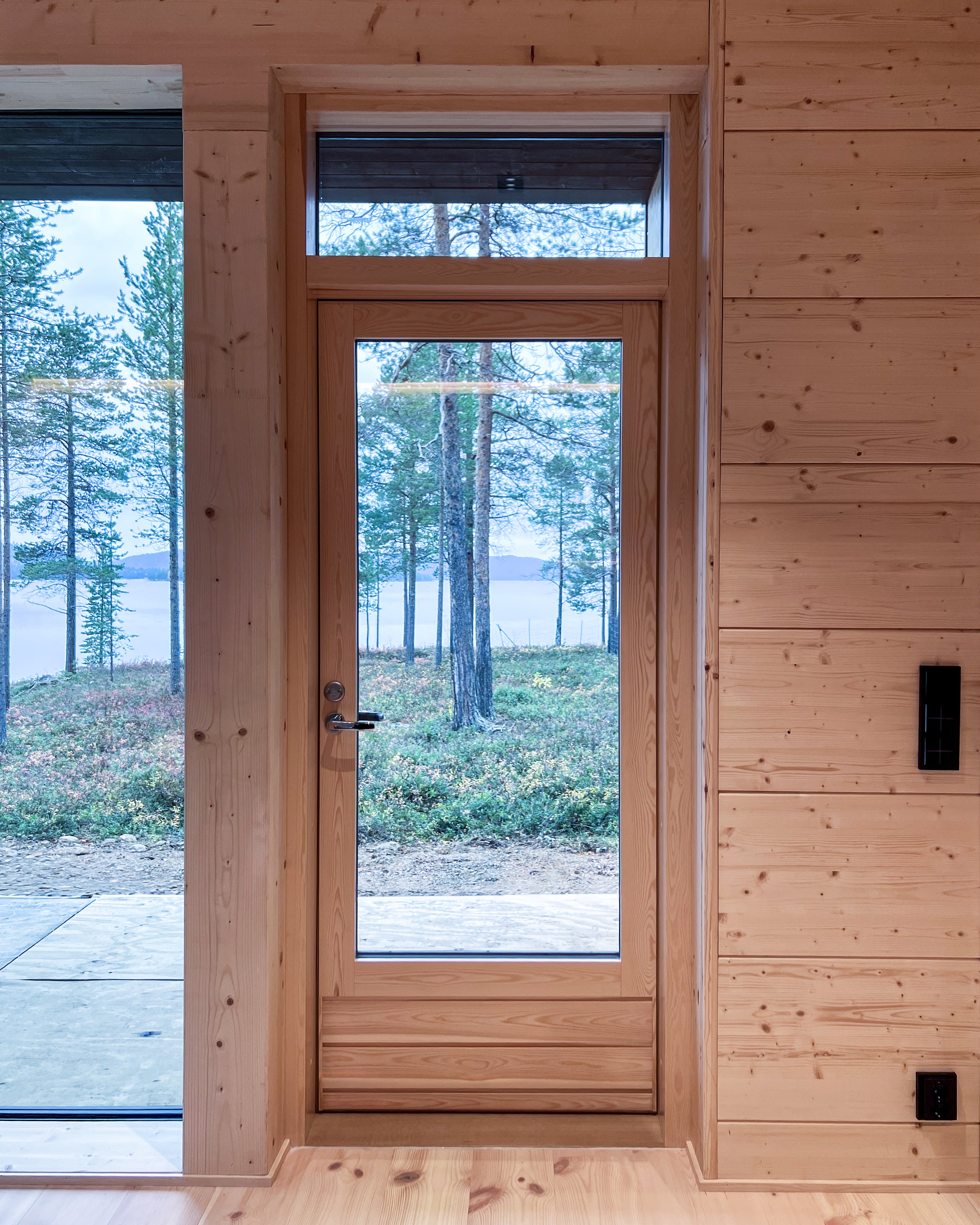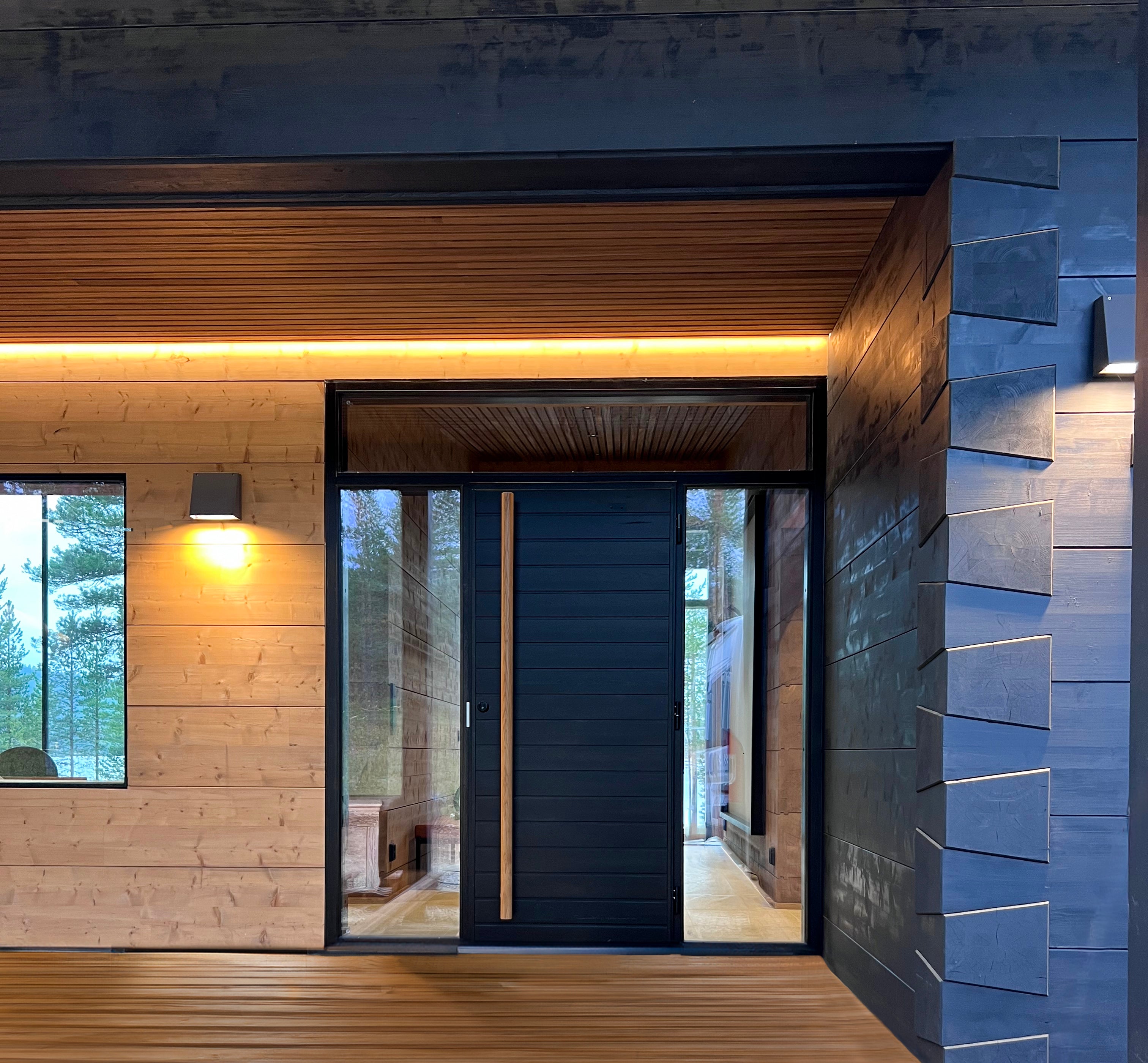 Valmistamme sisäänkäyntien ikkuna-ovikokonaisuudet yhtenäiseen karmiin. Selkeä ja silmää miellyttävä rakenneratkaisu massiivipuusta. Mallikuvat suuntaa antavia.