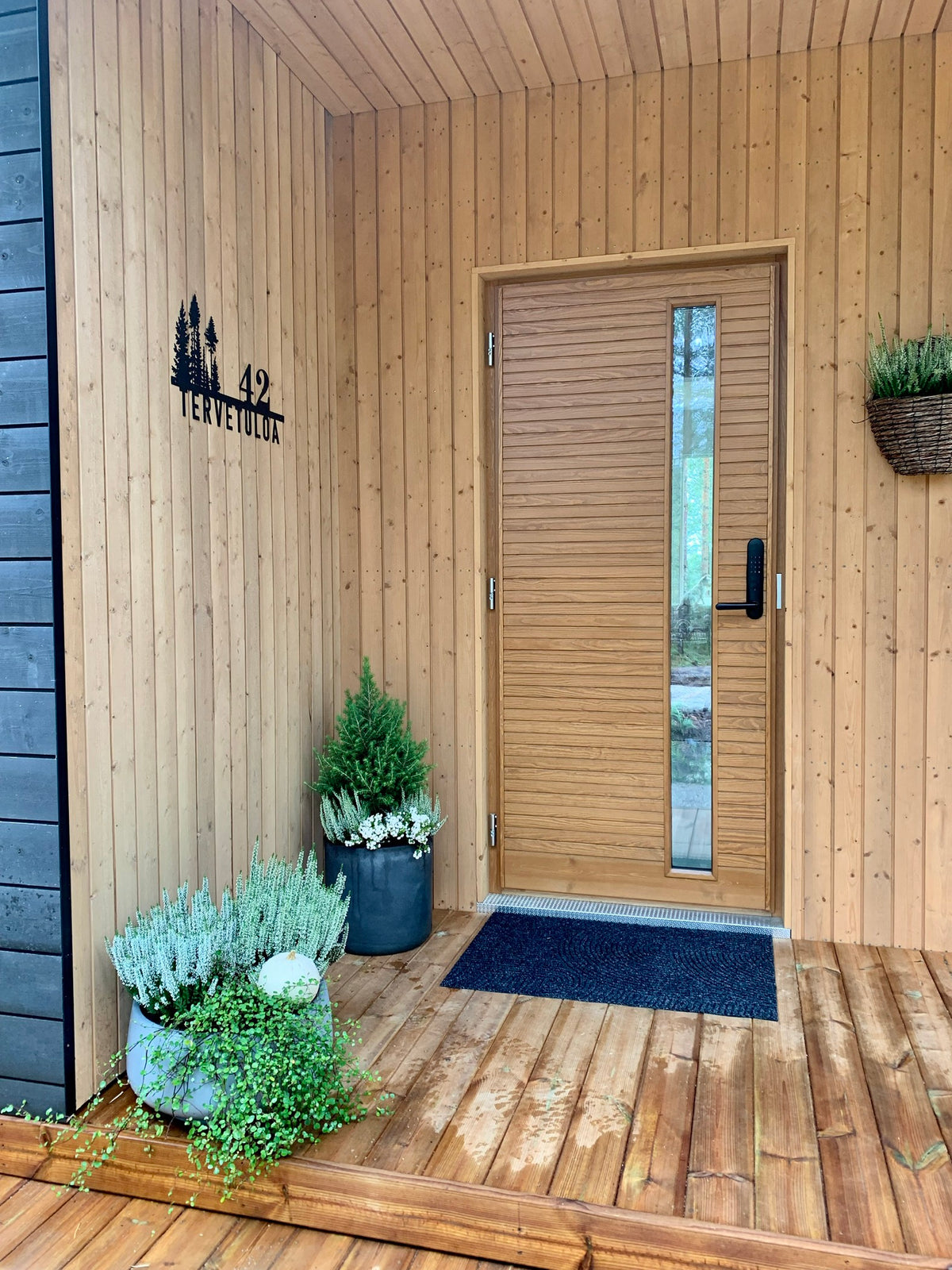 Sisäänkäyntiä voidaan yhtenäistää paneloimalla seinää sisäänkäyntielementin kanssa samalla puulla.