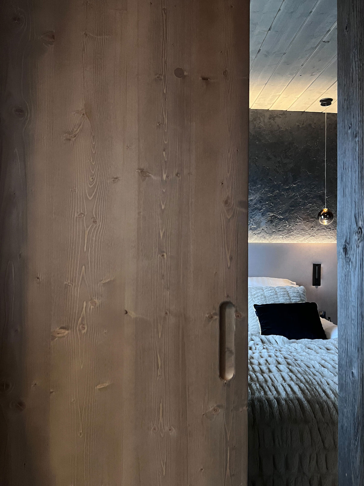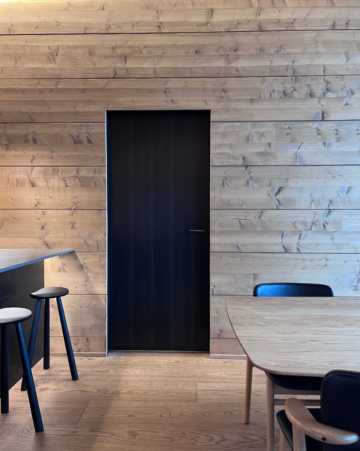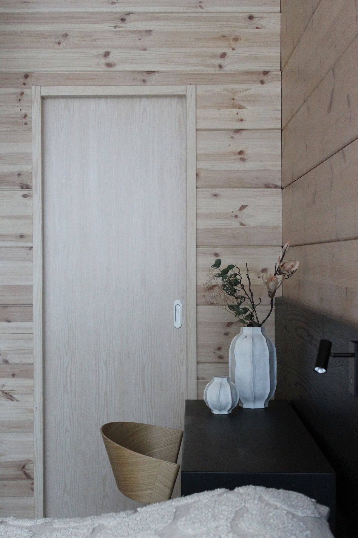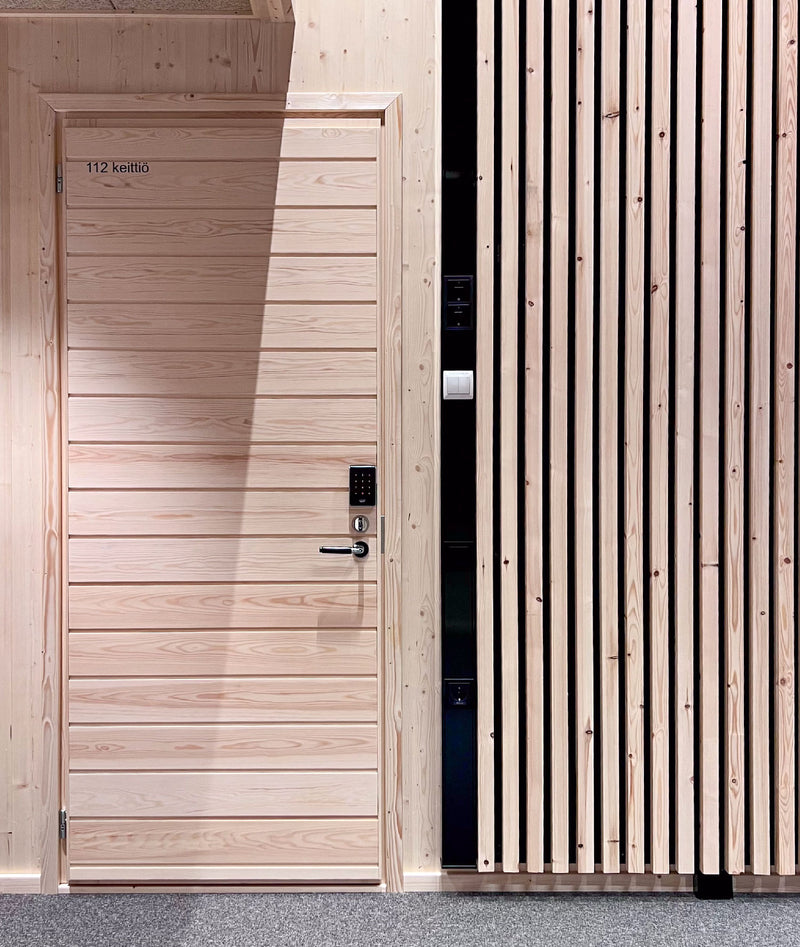 Kuultokäsitelty CLT-ovi on käsitelty muuhun sisustukseen sopivaksi.