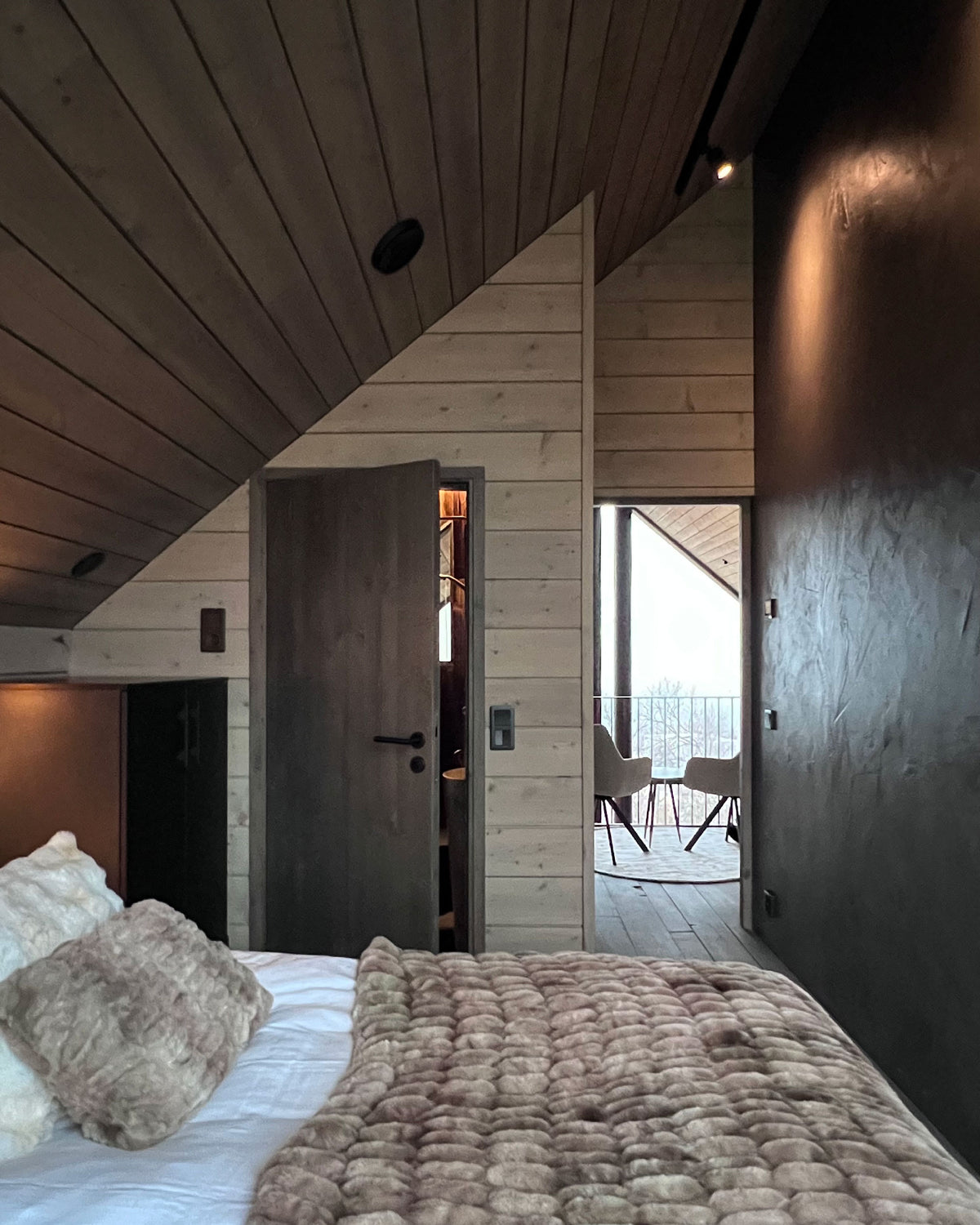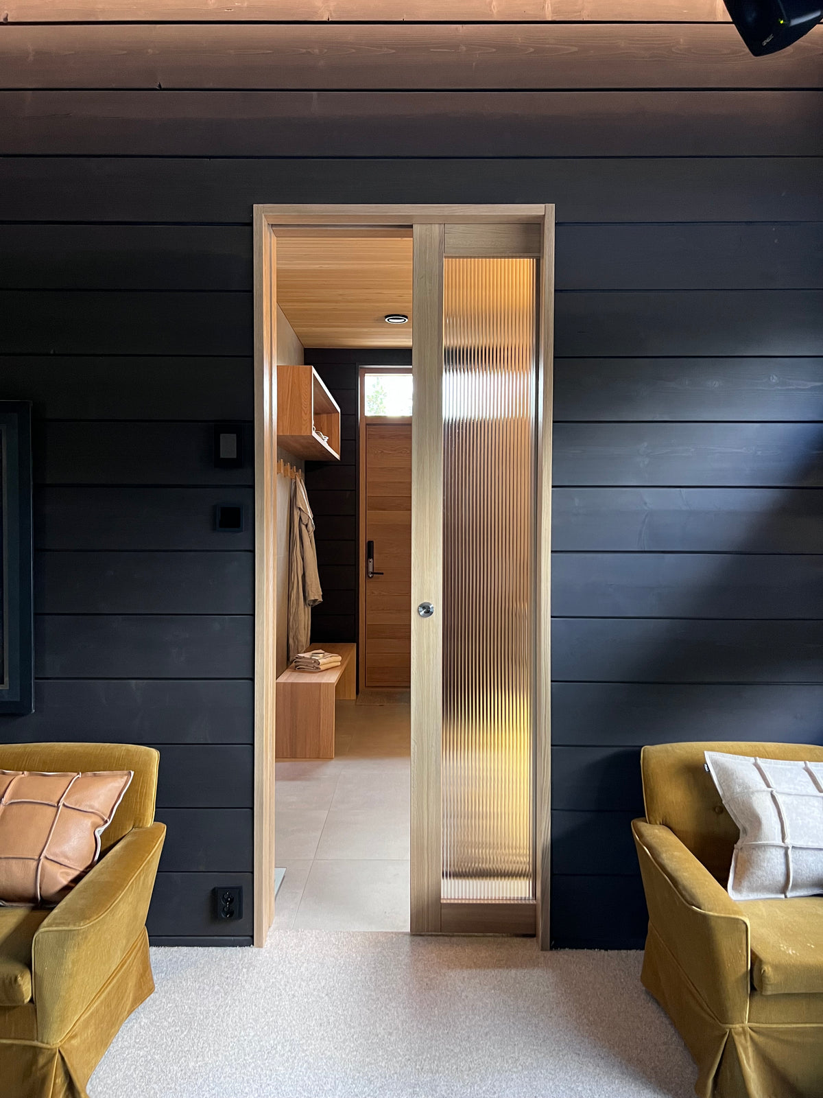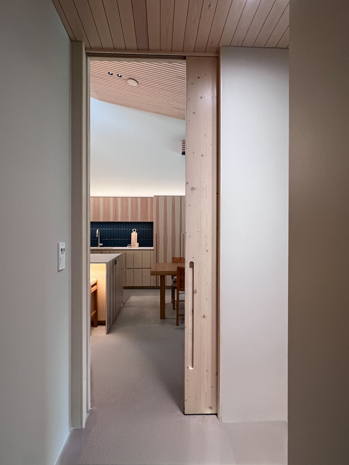 Kuultokäsitelty CLT-ovi on käsitelty muuhun sisustukseen sopivaksi.