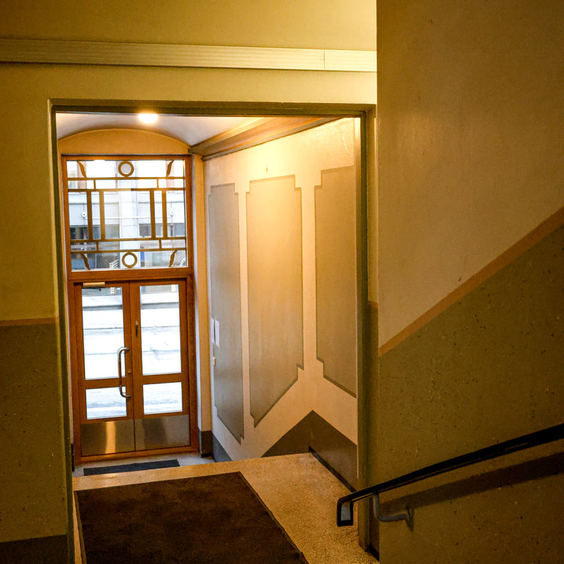Lasipintaa on usein paljon porrashuoneiden sisäänkäynneissä.