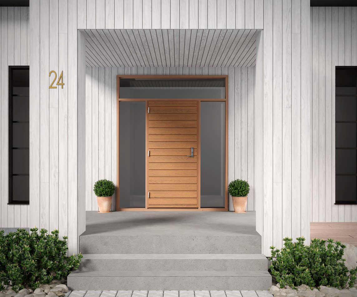 IO5-sisäänkäyntielementtiin kuuluu ulko-oven lisäksi yläikkuna sekä sivuikkunat oven molemmille puolille. Sisäänkäyntielementissä on ikkunat ja ovilehti ovat samassa karmissa. Yhteen karmiin valmistetuilla ovi-ikkuna kokonaisuuksilla saadaan selkeyttä, siroa ulkonäköä sekä enemmän lasipinta-alaa. Elementin puuosien valmistusmateriaali on oksaton mänty.