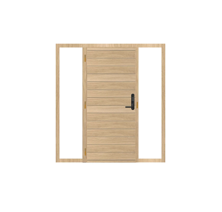 IO4-sisäänkäyntielementtiin kuuluu ulko-oven lisäksi sivuikkunat oven molemmille puolille. Sisäänkäyntielementissä on ikkunat ja ovilehti ovat samassa karmissa. Yhteen karmiin valmistetuilla ovi-ikkuna kokonaisuuksilla saadaan selkeyttä, siroa ulkonäköä sekä enemmän lasipinta-alaa. Elementin puuosien valmistusmateriaali on oksaton mänty.