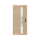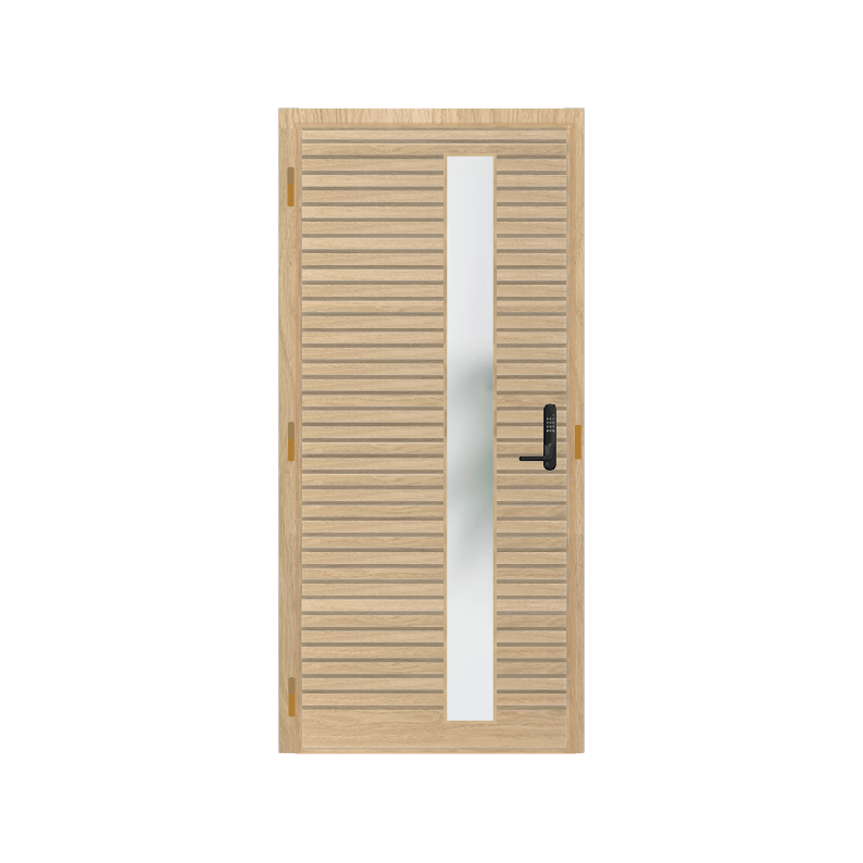 Pystylasi yhdessä kapean vaakapaneelin kanssa tekee Jyrävä-ovimallista raikkaan kokonaisuuden. Oven ulkonäköä täydentää alareunassa oleva yksittäinen leveä vaakapaneeli. Lasi on mahdollista ottaa myös etsattuna, kun halutaan lisätä yksityisyyttä.