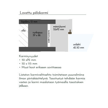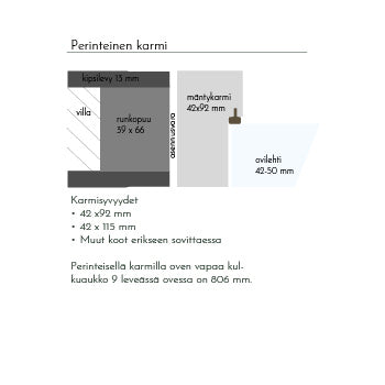Koivuvaneriovet valmistetaan massiivipuurunkorakenteella ja eristetään kivivillalevyllä. Ääneneristävyys luokka on Rw30db. Ovi on tilattavissa perinteisellä- tai piilotetulla mäntykarmilla.
