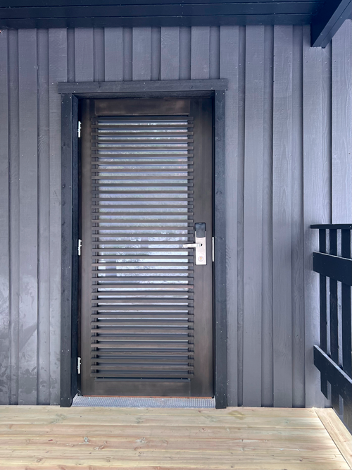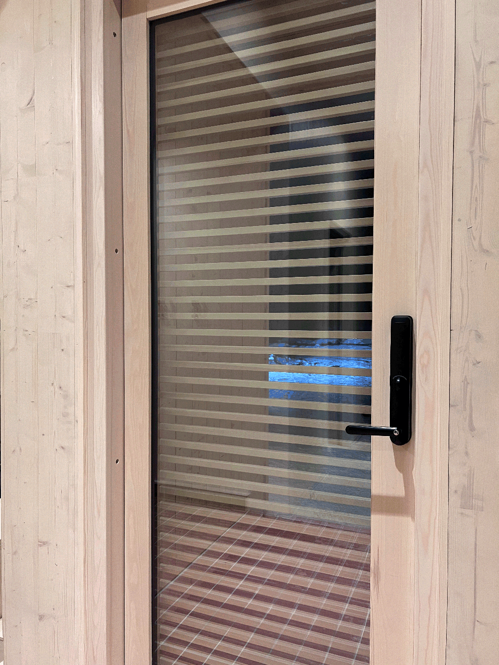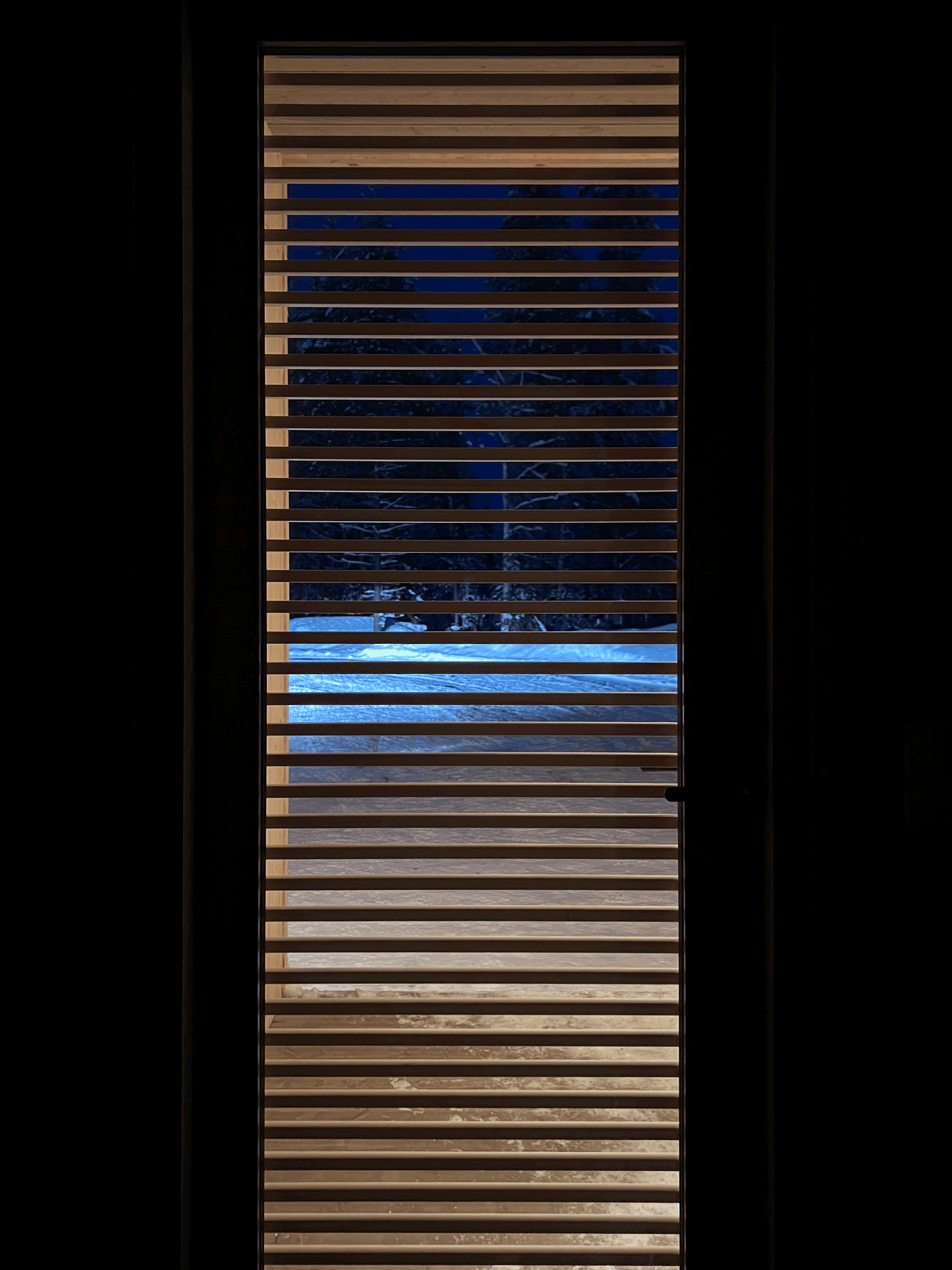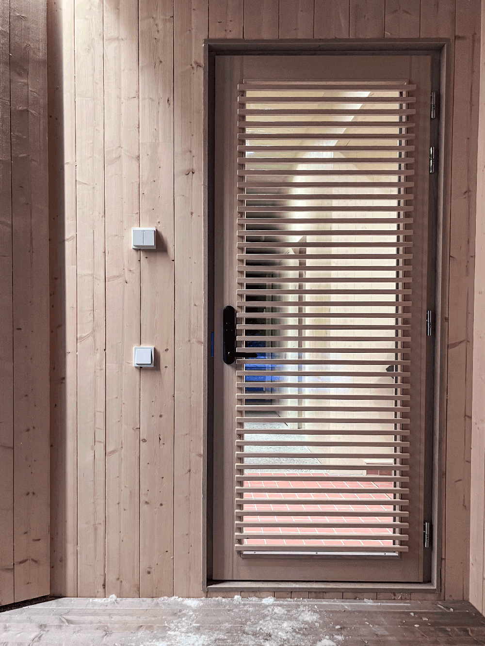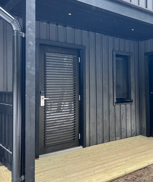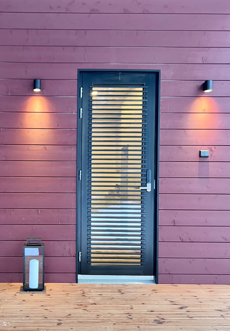 Kuopus-ovi on lasin ja puurimoituksen leikkisä yhdistelmä. Rima antaa näkösuojaa, mutta lasin ansiosta valo pääsee sisälle, muodostaen hauskoja varjoja. Kuopus-oven lasielementti on irroitettavissa mahdollista ulkopuolen lasipinnan pesua varten.