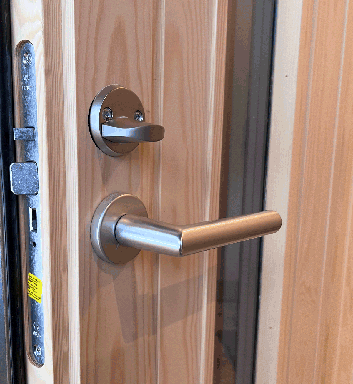 Tuote soveltuu oven paksuuksille 60-90 mm. Toimitus sisältää kaikki tarvittavat kilvet, ruuvit (katkouraruuvit M5x90), painikekaran (8x8x105mm).