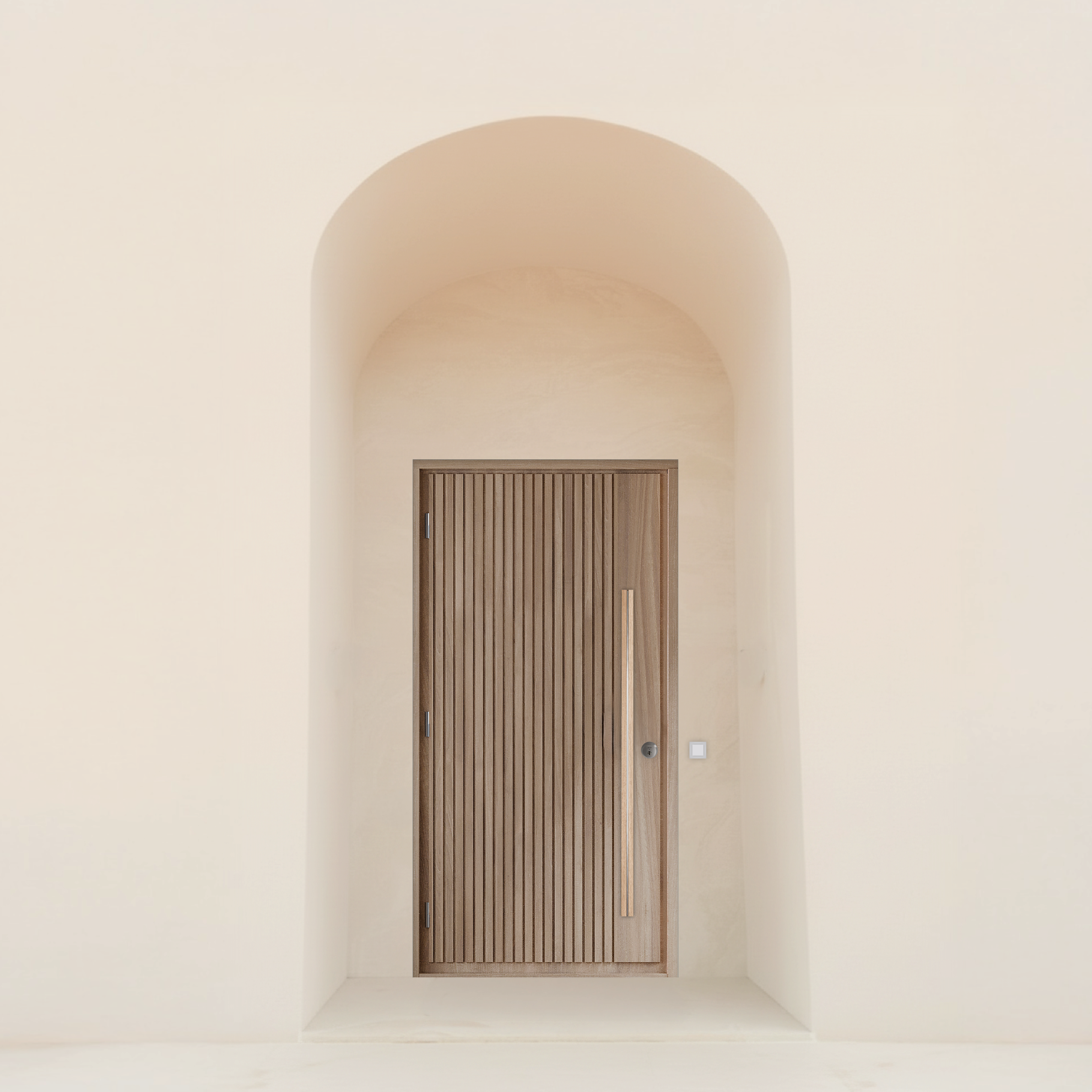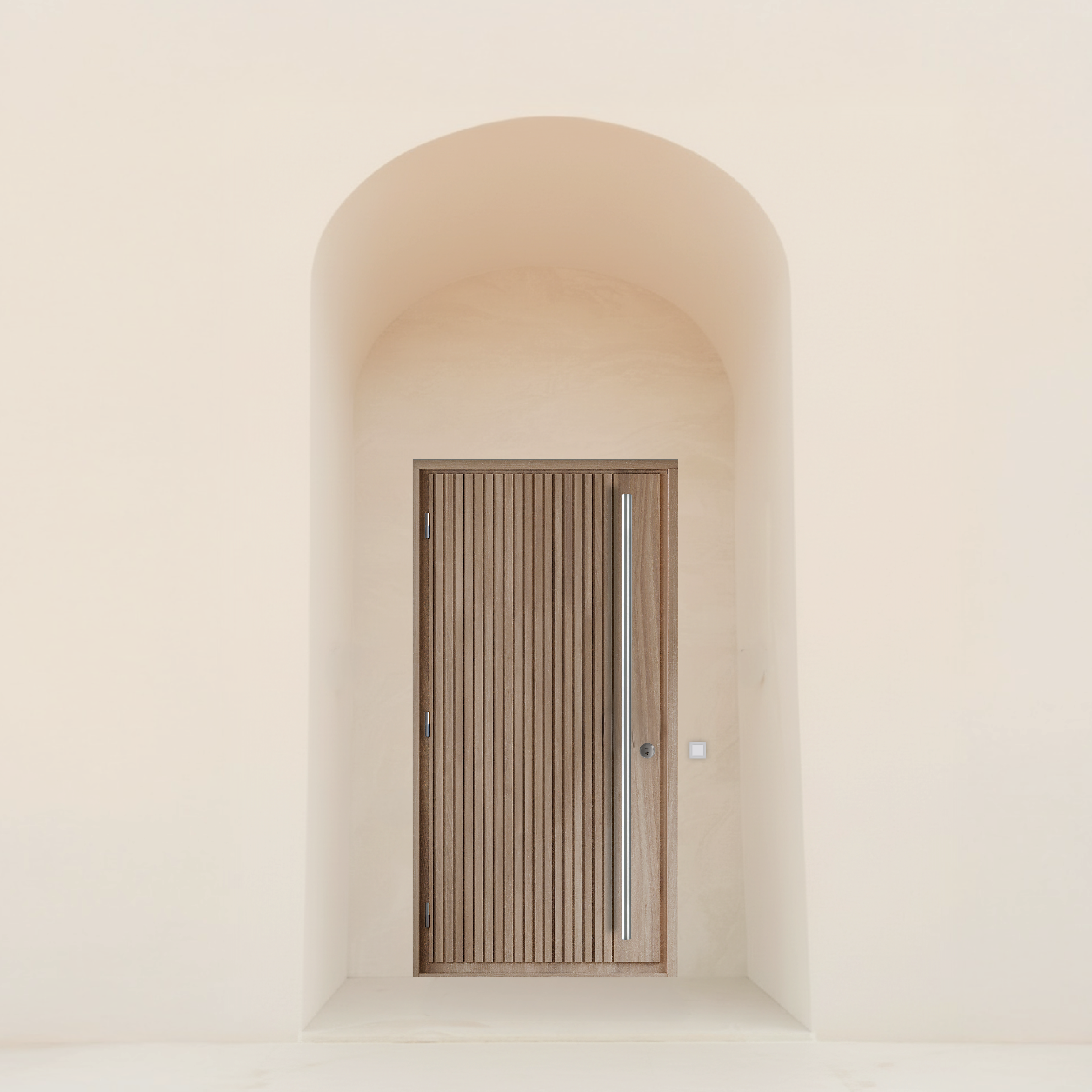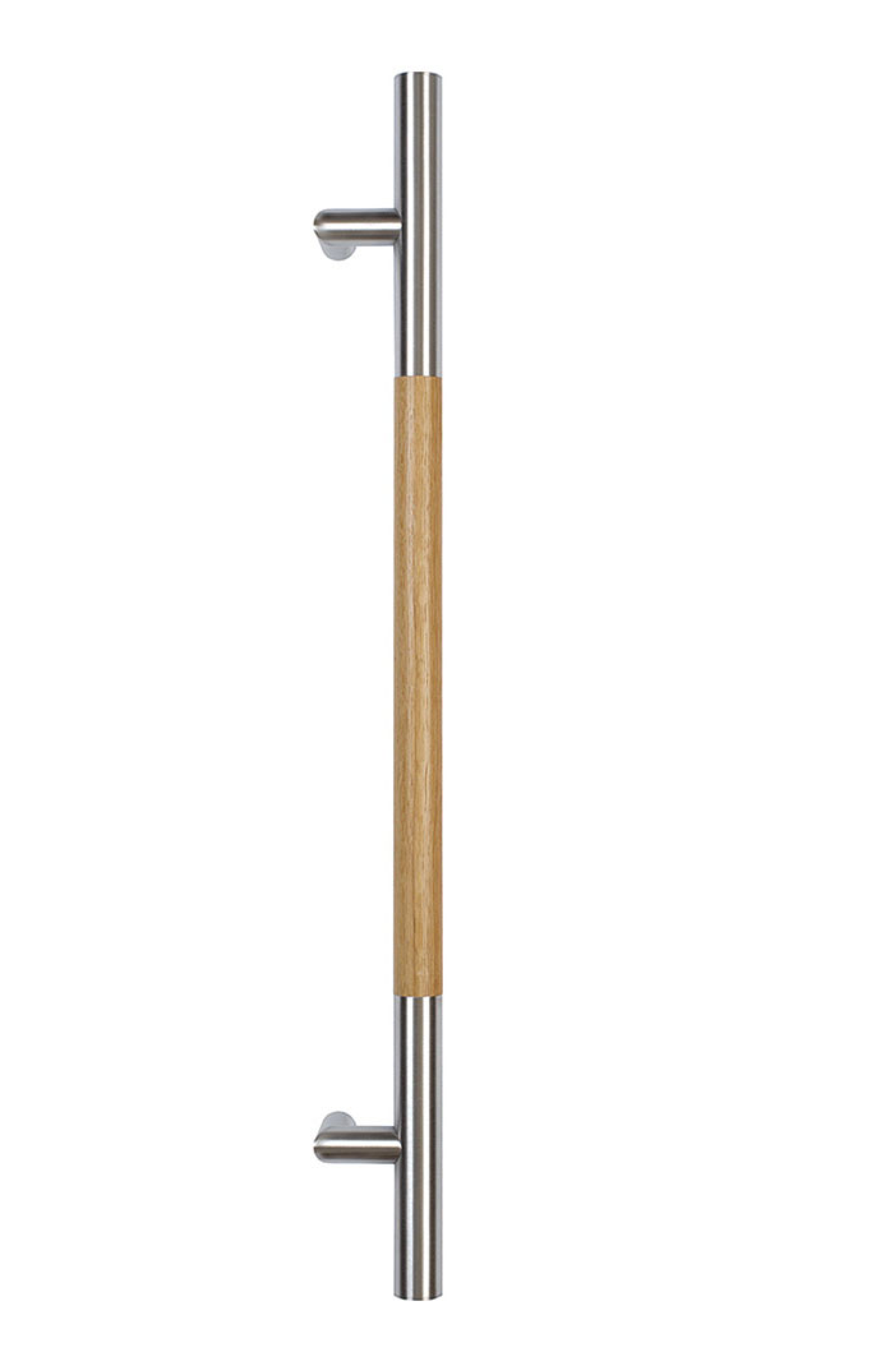 Teräsvedin tuo materiaalien kontrastin puuovelle ja viimeistelee sisäänkäynnin. Pitkällä vetimellä on myös hyvä erottaa pääsisäänkäynti sivuovista. Pitkä vedin mahdollistaa avaamisen eri korkeuksilta ja tekee käytöstä ergonomisen.